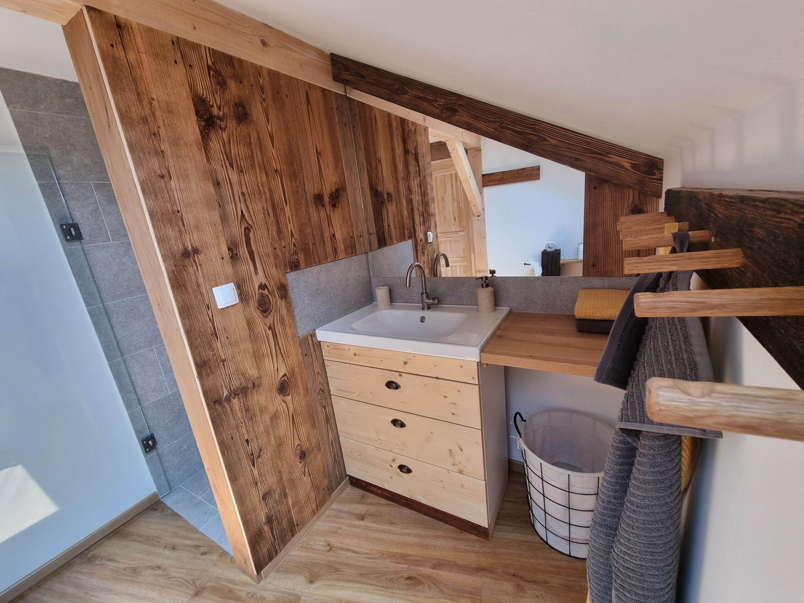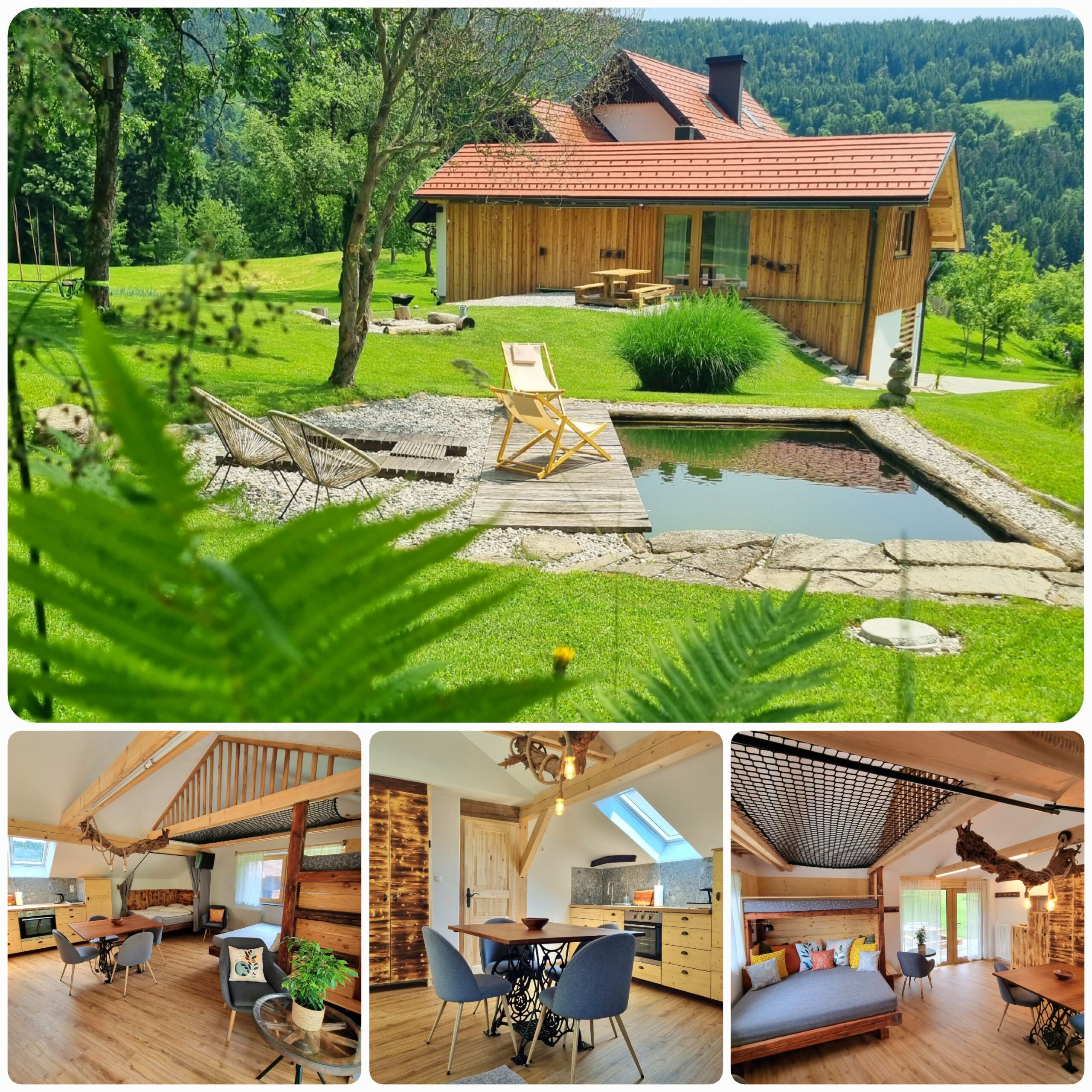 Apartma je zasnovan v odprti zasnovi. Ločena spalnica nudi zakonsko posteljo za 2 osebi. V dnevnem prostoru se nahaja dvignjen pograd za 2 osebi in kavč za raztegnit (1-2 osebi). Na podstrešju je dodatno ležišče za 2 osebi. V apartmaju je polno opremljena kuhinja ( indukcijska plošča, pečica, hladilnik, posode, krožniki, jedilni servis, sol, poper, olje, kis). Pozimi se apartma ogreva s centralnim ogrevanjem, za boljše vzdušje pa se lahko zakuri v kaminu.